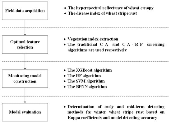 This study analyzed the hyperspectral data of winter wheat canopy to choose the vegetation indices and modeling methods that could identify the early and mid-term of stripe rust. The overall process, which consisted of four main steps: (1) field data acquisition, (2) optimal feature selection, (3) detecting model construction, and (4) model evaluation, is shown in Figure 1. In addition, the processing of the data was performed by Python for data analysis and model construction.