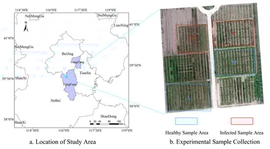 The experiment of winter wheat stripe rust was conducted at the experiment site in Langfang, Chinese Academy of Agricultural Sciences, Hebei Province (39°30′40″ N, 116°36′20″ E), China in 2017 and 2018. The area is a typical northern crop planting area in China with excellent soil quality that meets the natural conditions for the growth of winter wheat. During the experiment, the study area was divided into four groups, namely, A, B, C, and D (Figure 2). The area of each group was 220 m2, with A and D as the healthy groups and B and C as the infected groups. The experimental variety of winter wheat “Mingxian 169”, which is a susceptible wheat variety, was selected for artificial inoculation to achieve wheat stripe rust infection. The experiment was conducted by mixing pre-prepared wheat stripe rust fungus (spores) with water to form a spore suspension at a concentration of 9 mg/100 mL, spraying the suspension uniformly on wheat leaves with a hand-held sprayer, then covering the wheat with plastic film and removing it the next morning. The process follows the Technical Specification for Evaluation of Wheat Pest Resistance—Part I: Technical Specification for Evaluation of Wheat Resistance to Stripe Rust (NY/T 1443.1-2007). In addition, pesticides were sprayed on healthy wheat areas to prevent them from being infected with stripe rust, and the entire experimental area was managed in the same way (using 200 kg/ha nitrogen and 450 m3/ha water).