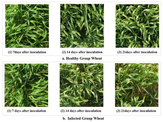 Samples of the inoculation of stripe rust during different infection periods; (a) Healthy group wheat; (b) Infected group wheat.