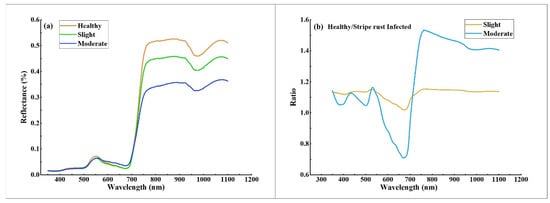 (a) The average canopy spectral reflectance of different stripe rust infection levels; (b) The spectral ratios of stripe-rust-infected wheat compared to healthy winter wheat.