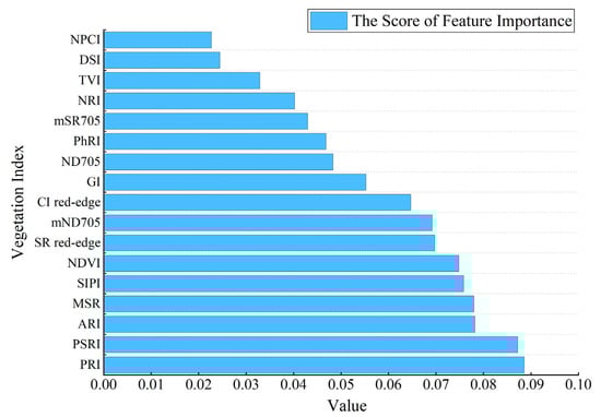 Based on the significant role of vegetation indices in detecting the occurrence of plant diseases in existing studies, the coefficient of determination r2 (square of the correlation coefficient) obtained from the CA of vegetation indices and DI associated with wheat stripe rust was calculated, as shown in Figure 5. An independent sample t-test was used to obtain confidence values (p) for the healthy and infected samples in 21 vegetation indices. The p that corresponds to each feature in the figure of the selected vegetation indices showed excellent potential for early and mid-term detection of winter wheat stripe rust (p < 0.001), except for RVSI, WI, MCARI, and YRI (p < 0.01). The data from Figure 5 show that the PRI had the highest coefficient of determination (r2 > 0.80) value, which represented the highest correlation between the PRI and the occurrence of early and mid-term winter wheat stripe rust. Huang et al. [] also found that PRI can characterize the occurrence of wheat stripe rust well and completed the quantitative inversion of this disease by PRI in their study. Based on the confidence values of vegetation indices and DI, 17 vegetation indices, including NDVI, SIPI, NRI, PSRI, MSR, PRI, PhRI, NPCI, and ARI, were found to reflect the disease incidence of early and mid-term winter wheat stripe rust (p < 0.001) better, and these vegetation indices were used as the initial selection characteristic variables for subsequent research work.