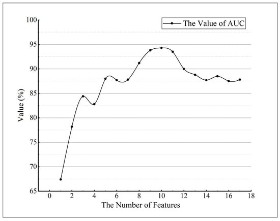 Due to the presence of more redundant information among the primed features, this paper opted for correlation analysis (CA) combined with the RF algorithm (CA-RF) for modeling feature selection. The RF algorithm is an integrated machine learning approach with a decision tree-based classifier that contains the bootstrap aggregating algorithm and feature subspace concept []. It can also evaluate the importance of feature variables based on the cross information between vegetation index features and the DI of stripe rust. The importance of feature variables was evaluated and ranked by feature importance scores []. Due to the coincidence of random sample sampling during the operation of the algorithm, the RF algorithm was iterated 500 times to calculate the average value of the characteristic importance score and combined with the model AUC value to select the character set that best responded to the early and mid-term of winter wheat stripe rust []. The AUC value of a model, which is the area under the receiver operating characteristic (ROC) curve, is often widely used to test the discriminative ability of a classification model, reflecting the validity and truthfulness of the model [].