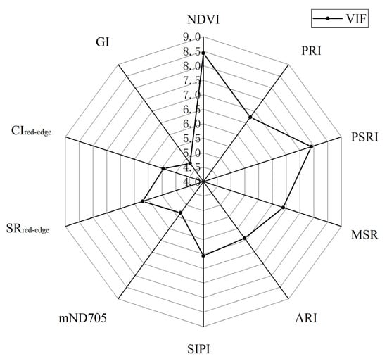 To obtain the set of features with less redundant information content, the experiment used the RF algorithm to calculate the error value of out of bag data in the dataset to achieve the importance ranking of the initial feature variables, and the higher the feature importance score was, the more important the feature was [,]. The ranking results in Figure 6 revealed that the ability of different vegetation indices to characterize early and mid-term winter wheat stripe rust varied, with PRI having the highest importance score among the 17 vegetation indices, mainly due to the mechanism of crop exposure to disease stress [,,]. Considering that too much or too little selection of the final feature set can affect the accuracy and stability of the model, we selected different values according to the results of the feature importance ranking for testing to find the appropriate number of features (k) and determined the final selected values by comparing the effects of different values on the model area under curve (AUC) values. The data results in Figure 7 show that the model AUC value was the largest when the number of features was 10, and the higher the AUC value is, the better the stability of the model and the reliability of the classification results will be [,]. In addition, we performed a variance inflation factor (VIF) test on the characteristic variables, and this result indicated that no strong multicollinearity was observed between the characteristic variables (Figure 8, VIF < 10) []. After the above analysis, a total of 10 vegetation indices, namely, PRI, PSRI, MSR, NDVI, ARI, SIPI, mND705, SRred−edge, CIred−edge, and GI, were selected as the final input features of the model to complete early and mid-term winter wheat stripe rust detection.
