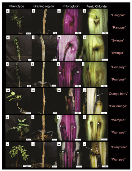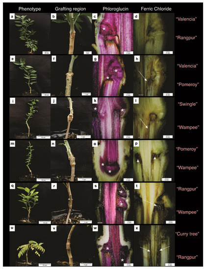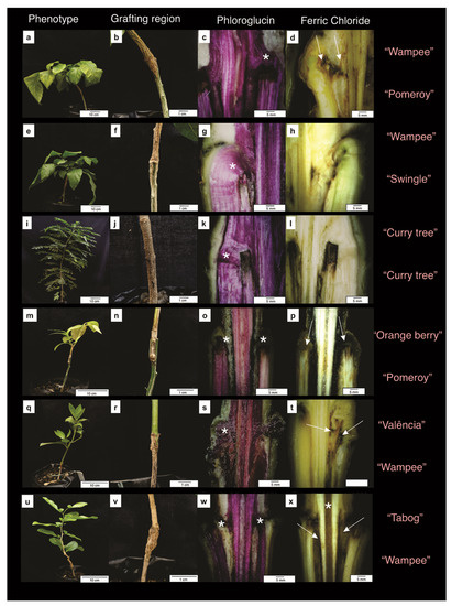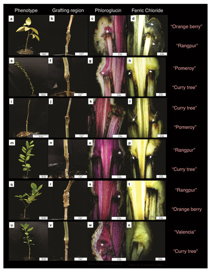 Conversely, partial or fully incompatible S/R combinations were observed in several cases, notably in Rangpur/Wampee (Figure 1q–t), Curry tree/Rangpur (Figure 2u–x), Orange berry/Rangpur (Figure 4a–d), Curry tree/Wampee (Figure 2u–x), Tabog/Wampee (Figure 3u–x), Pomeroy/Curry tree (Figure 4e–h), Curry tree/Pomeroy (Figure 4i–l), and Rangpur/Orange berry (Figure 4q–t). These examples did not have differentiated xylem-derived calli and presented with increased levels of phenolic compounds as biochemical markers of graft incompatibility [24,25,26].