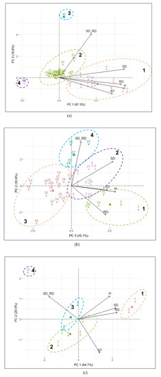 Hierarchical clustering analysis was applied to the entire dataset. All evaluated groups of grafted S/R combinations, both in the greenhouse and in the field, were arranged into four clusters (Figure 5), with the biological significance of this varying slightly for each assessment group. For this reason, each cluster for each experiment was presented separately.