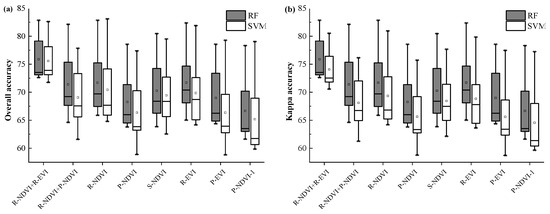 - R-NDVI + P-NDVI: a combination of original NDVI time series and NDVI-derived phenological parameters (49 bands, 23 NDVI + 26 vegetation phenometrics).