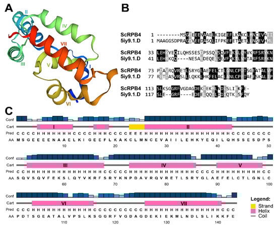 Sugarcane transcriptomic studies [,,] have allowed the identification of genes involved in stress tolerance [,] as well as in plant development []. However, to date, there are no studies characterizing sugarcane RNA polymerase II, a key enzyme that transcribes thousands of protein-coding genes and non-coding RNAs with diverse functions. RNA polymerase is a complex molecule composed of multiple subunits. The fourth and seventh largest subunits—Rpb4 and Rpb7—form a heterodimer localized near the primary transcript exit and next to the carboxy-terminal domain linkage region []. Our structural comparison using the human Rpb4 subunit solved at a near-atomic resolution [] allowed us to predict ScRpb4’s tertiary structure (Figure 1A). However, unlike the human Rpb4 formed by six α-helices [], ScRpb4 contains seven α-helices (Figure 1C). The heterodimer formed by the human Rpb4 and Rpb7 is wrapped from the six helices of the Rpb4 protein and packed around the middle region of Rpb7. Rpb4’s fifth strand of the β-sheet is formed from residues near the N-terminus []. Despite the fact that ScRpb4 has an extra α-helix, the function likely is the same as previously described in many other organisms for the Rpb4 subunit.