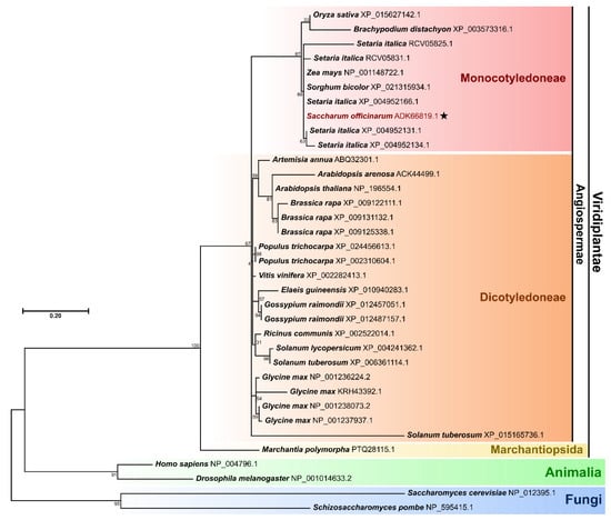 To further explore the phylogenetic relationships between the sugarcane Rpb4 and proteins of other plant species and kingdoms, we constructed a phylogenetic tree using the Maximum Likelihood method (Figure 2). ScRpb4 has high homology to Setaria, sorghum, and maize within the monocotyledonous group. However, the evolutionary divergence of monocots’ Rpb4 proteins compared to dicotyledonous plants is clear (Figure 2). Interestingly, a related Rpb4 protein was also found in the bryophyte Marchantia polymorpha, which suggests the importance of this protein through evolution. Our analysis also yielded proteins in animals and fungi. Collectively, our analysis shows the presence of the RNA polymerase II subunit V across kingdoms and within many monocots and dicots plants.