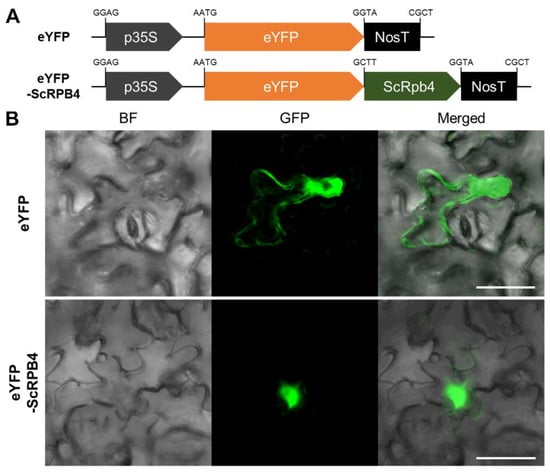 The transcription machinery and its transcriptional regulators are known to be located in the nucleus. Since we did not have any information regarding whether the identified ScRpb4 was indeed a subunit of the RNA polymerase II, we decided to determine the subcellular location using transient expression in tobacco leaves. We fused the full coding sequence with the enhanced yellow fluorescence protein (eYFP) using the golden gate system (Figure 3A). ScRpb4 was localized in the nucleus (Figure 3B), corroborating the structural (Figure 1) and phylogenic analysis (Figure 2), which indicated the RNA polymerase II function. Interestingly, using WoLF PSORT, no predicted localization in the nucleus was found.