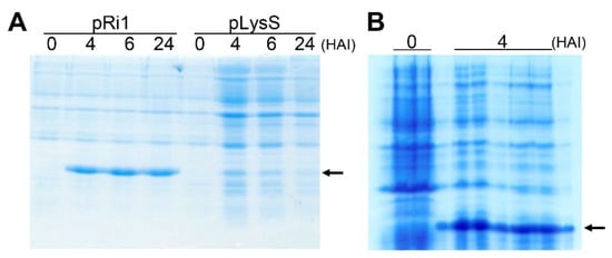 Since little was known about the identity of the sugarcane Rpb4 protein, we decided to analyze its expression using an inducible system in small- and large-scale experiments. First, pET-28a::Rpb4, containing the ScRpb4 sequence cloned in the pET-28a expression vector, was evaluated in a small-scale experiment using two E. coli cell lines, pRi1 and pLysS. Both cell lines showed expression of the recombinant protein 4 h after induction (Figure 4A). However, the expression levels in pRi1 were much higher than in pLysS. While the protein expression levels in pRi1 were similar at 4, 6, and 24 h after induction, in pLysS, the protein expression levels decayed over time (Figure 4A). Our small-scale experiment showed that pET-28a::Rpb4, expressed in the E. coli cell line pRi1 at 37 °C, presented the best expression system for ScRpb4 during all times tested (Figure 4A). A large-scale experiment was then conducted to obtain larger protein amounts (Figure 3B). Overall, 4 h of induction at 37 °C using pRi1 cells constituted the best conditions to express sugarcane Rpb4. Our results open the window to more specific experiments to study ScRpb4 function; for instance, crystal structure determination and pull-down assays.
