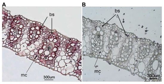 Ubiquitous expression of ScRpb4 transcripts in mature sugarcane leaves. (A) Hybridization signal of ScRpb4 mRNA across transversal sections of a mature sugarcane leaf. Accumulation of ScRpb4 transcripts is observed as a purple precipitate. (B) Sense probe used as a control. No signal was detected. bs, bundle sheath cells; x, xylem; p, phloem; mc, mesophyll cells. Scale bar = 300 µm.