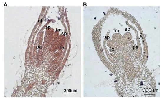 ScRpb4 expression in reproductive meristems. (A) Hybridization signal of ScRpb4 mRNA across longitudinal sections of meristems during reproductive development. ScRpb4 expression is represented as purple precipitate. (B) Expression of sense probes used as a control. No hybridization signal was observed. gl, glumes; pa, palea; lo, lodicules; sp, spikelet pair meristem; fm, floral meristem. Scale bar = 300 µm.