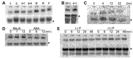 RNA was extracted from different sugarcane tissues using Trizol (Invitrogen, Waltham, MA, USA) as previously described []. RNA integrity was confirmed using formaldehyde–agarose gel and quantified by spectrophotometry. Northern blots were conducted to evaluate the amount of RNA expression in different tissues. Nitrocellulose membranes were used for the following: (1) different tissues—mature leaf (L), immature leaf (IL), first (lowest) internode (In1), fourth internode (In4), lateral bud (B), root (R), flower (F); (2) in response to cold (4 °C) in vivo and in vitro; (3) lateral bud development; (4) in response to methyl jasmonate (MeJA) and abscisic acid (ABA); as well as (5) in roots exposed to phosphorus privation.