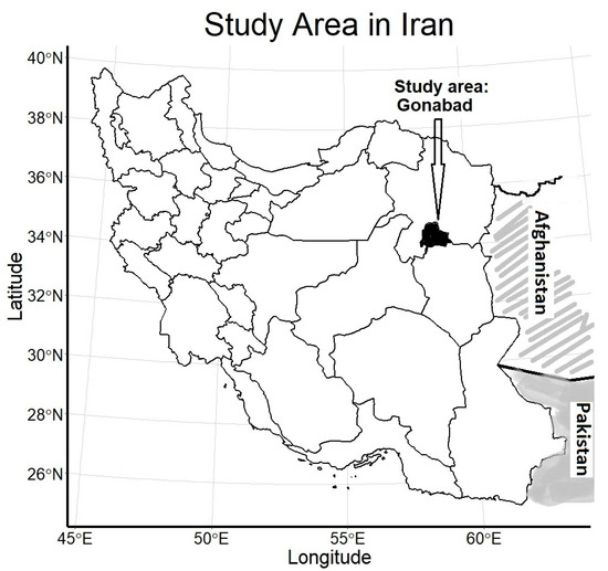 Located in the southern part of the Khorasan Razavi province of Iran and near to the Afghanistan border, Gonabad county was selected as the study area (see Figure 1). The region is historically well known for farming activities, especially saffron cultivation. Apart from saffron, grapes, pistachios, cumin, wheat, barely, pomegranate, and almonds are also produced in this area. In spite of suffering from and being affected by droughts for several years, saffron farming is still one of the most important activities in this region due to the crop’s high drought resistance. From the 14,300 hectares of available arable land in Gonabad county, almost 3600 hectares are allocated to saffron cultivation, with a total annual production of 10.8 tonnes, accounting for 40% of all income from agricultural products in the county [30]. Farm monitoring shows that saffron growers in Gonabad have a tendency to plant saffron in high densities. Appropriate corm planting density for the saffron fields of Gonabad was estimated to be at a level of 3.2 tonnes of corms/ha among experienced farmers. However, our observations imply that about 40% of farmers practice higher corm planting densities of up to 7 tonnes/ha.