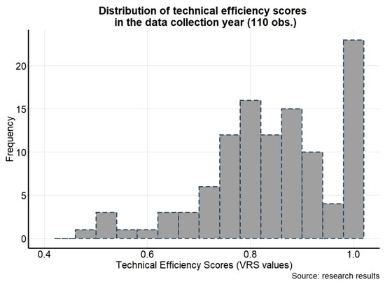 Distribution of technical efficiency scores in the data collection year (110 observations).