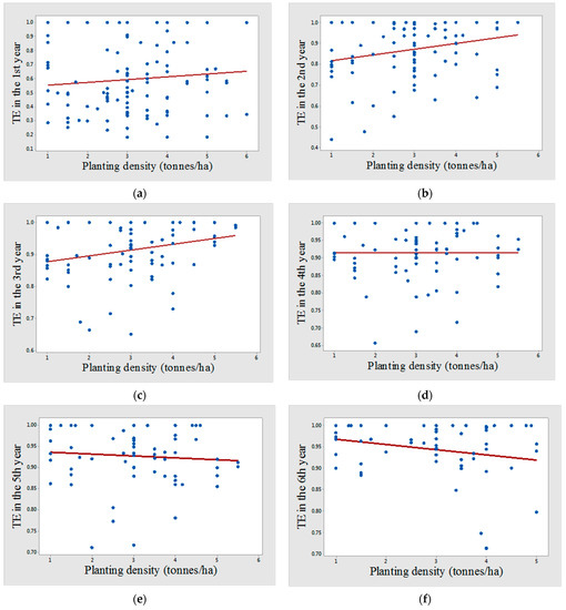 Panels (a–f) depict the relationship between corm planting density and technical efficiency in the first six years of farm utilisation.