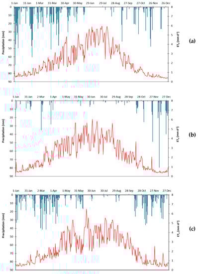 Precipitation (mm, blue bars) and reference evapotranspiration (ETo, mm d−1, red line) data: (a) 2016; (b) 2017; and (c) 2018.