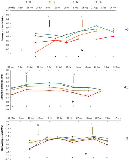 Evolution of stem water potential during the three growing seasons: (a) 2016; (b) 2017; and (c) 2018. Arrows represent the irrigation start date. I, flowering; M, veraison; * indicates significance at p < 0.05. T0, Rainfed (0% ETo); T1, drip irrigated at 30% ETo from the beginning of veraison to harvest; T2, drip irrigated at 30% ETo from pea size to harvest; and T6 (control), drip irrigated at 30% ETo from budburst to harvest.