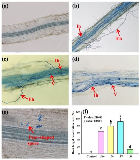 No signs of fungal colonization were observed in roots of V. villosa plants not inoculated with any fungi, while roots inoculated with symbiotic fungi showed signs of fungal colonization (Figure 1a–e), with the root fungal colonization rate ranging from 12% to 92%. A significantly higher root fungal colonization rate was listed as the order of Ri > Ds > Fm > Si (Figure 1f).