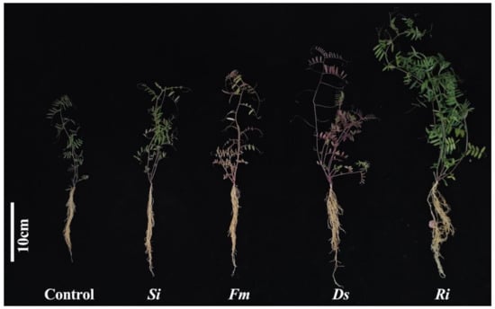 In this study, root architecture (especially total length) of V. villosa plants was improved to different degrees by symbiotic fungi, and the positive effect was most pronounced for Fm and Ri inoculations, indicating that symbiotic fungi act as a biostimulator to promote the establishment of root architecture, but it depends on the symbiotic fungi species used. This is consistent with the results of Huang et al. [] on Juglans regia plants colonized by AMF and Feng et al. [] on Lycopersicum esculentum plants inoculated with five AMF isolates. The improvement of root architecture by symbiotic fungi is related to the increase of auxins, polyamines, and dopamine concentrations in the host by the fungi [,].