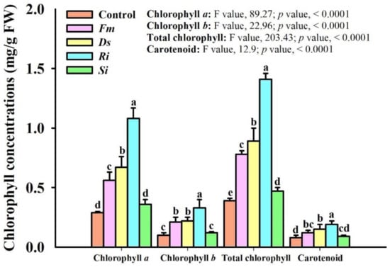 All three AMF inoculations dramatically raised leaf chlorophylls a and b, and total chlorophyll and carotenoid concentrations, accompanied by a significant increase only in total chlorophyll after Si inoculation (Figure 3). Compared to the control, chlorophylls a and b, and total chlorophyll and carotenoid were increased by 93%, 110%, 100%, and 50% in Fm, 131%, 120%, 128%, and 88% in Ds, and 272%, 230%, 262%, and 138% in Ri, respectively.