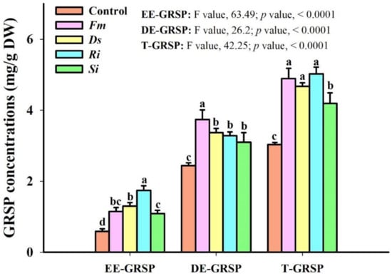 In comparison with the control, inoculation of Fm, Ds, Ri, and Si significantly increased soil GRSP levels, with EE-GRSP levels being increased by 95%, 120%, 195%, and 85%, DE-GRSP levels by 53%, 38%, 34%, and 27%, and T-GRSP levels by 61%, 54%, 66%, and 38%, respectively (Figure 4).