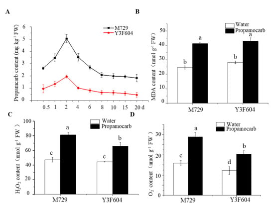 Propamocarb residues and phytotoxicity in the leaves of M729 and Y3F604 cucumber varieties. (A) Propamocarb residues at 0.5, 1, 2, 4, 6, 8, 10, 15, and 20 d; (B) MDA content at 2 d; (C) H2O2 content at 2 d; and (D) O2− content at 2 d after application of 2 mM propamocarb. Data are the means of three replicates with SEs, and different letters indicate significant differences (p < 0.05).