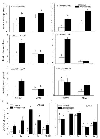 CsGSH2 expression analysis in cucumber under propamocarb stress. (A) Expression levels of six genes of the glutathione pathway. Dynamic expression of CsGSH2 in the leaves of (B) Y3F604 and (C) M729. The relative expression levels of the genes were analyzed by qRT-PCR using CsEF1α as the reference gene. Data are the means of three replicates with SEs, and different letters indicate significant differences (p < 0.05).