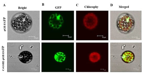 Arabidopsis protoplast was transfected with the 35S:CsGSH2 and 35S:GFP plasmids to determine CsGSH2 subcellular localization. After 16 h of light culture, the GFP fluorescent signal was detected throughout the cell due to the 35S:GFP plasmid. Conversely, the signal was mainly detected in the cytoplasm of Arabidopsis cells transfected with the 35S:CsGSH2 construct (Figure 3), indicating CsGSH2 as a cytosolic protein.