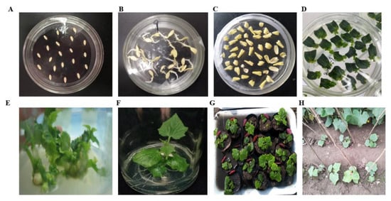 Genetic transformation of cucumber by CsGSH2-p1250. (A) Seeds of M729. (B) Seed germination. (C) Agrobacterium-mediated infection of cotyledon nodes. (D,E) Differentiation culture. (F) Rooting culture. (G) Domestication culture. (H) Transplanting in the greenhouse.