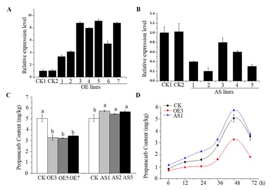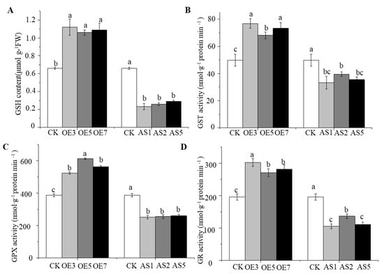 To further analyze the CsGSH2 function, we measured GSH content in transgenic plants and controls. GSH content increased by 38.9%, 32.6%, and 35.3% in the OE3, OE5, and OE7 lines, while it decreased by 15.1%, 16.6%, and 17.1% in the AS1, AS2, and AS5 lines compared with the control plants (Figure 6A). Furthermore, the activity of the major glutathione pathway enzymes significantly increased in the CsGSH2-overexpressing plants. We observed a 54.2%, 36.5%, and 46.5% increase in the OE3, OE5, and OE7 plants and 33.3%, 23.7%, and 28.7% decrease in the AS1, AS2, and AS5 plants (Figure 6B). GPX and GR activities also considerably increased in the CsGSH2-overexpressing plants, while lower activities were detected in the antisense plants compared with the control (Figure 6C,D). These results indicate that the overexpression of CsGSH2 contributed to the accumulation of GSH and increased the activity of key enzymes of the glutathione pathway involved in propamocarb detoxification.