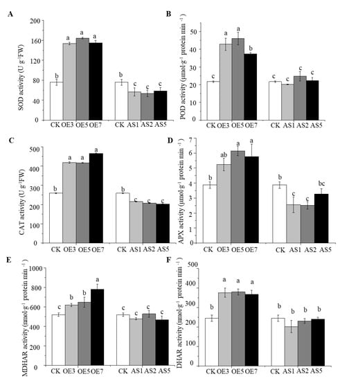 Antioxidant enzyme activities in the leaves of the control, CsGSH2-overexpressing (OX), and antisense (AS) plants at 48 h after propamocarb application. (A) Superoxide dismutase (SOD) activity. (B) Peroxidase (POD) activity. (C) Catalase (CAT) activity. (D) Ascorbate peroxidase (APX) activity. Data are the means of three replicates with SE, and different letters indicate significant differences (p < 0.05). (E) Monodehydroascorbate reductase (MDHAR) activity. (F) Dehydroascorbate reductase (DHAR) activity. Data are the means of three replicates with SE, and different letters indicate significant differences (p < 0.05).