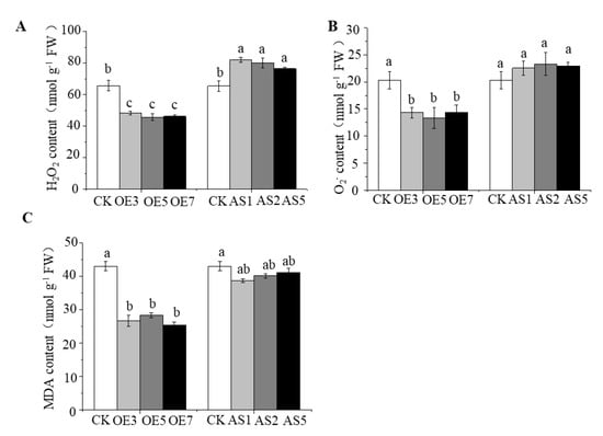 As shown in Table 2, GSH, GSSG, and total glutathione content significantly increased in the OE3, OE5, and OE7 plants and decreased in the AS1, AS2, and AS5 plants. The GSH/GSSG ratio increased by 32%, 21%, and 26% in the OE3, OE5, and OE7 lines, respectively, and decreased by 13%, 17%, and 8% in the AS1, AS2, and AS5 plants, respectively, compared with the control. Similarly, the content of AsA and total ascorbate significantly increased in the OE3, OE5, and OE7 lines, while the content decreased in AS1, AS2, and AS5 lines. However, the DHA content was lower in the OE3, OE5, and OE7 lines than in the AS1, AS2, and AS5 lines and the control. The AsA/DHA ratio increased by 13%, 19%, and 12% in OE3, OE5, and OE7 lines, while it decreased by 18%, 10%, and 7% in AS1, AS2, and AS5 lines compared to the control; these observations indicate that the conversion of DHA to AsA was promoted in CsGSH2-overexpressing plants. In addition, the CsGSH2-overexpressing plants demonstrated increased MDHAR and DHAR activities, while the antisense plants demonstrated decreased activities (Figure 7E–F). These results indicate that the overexpression of CsGSH2 regulated propamocarb metabolism by moderating the AsA-GSH cycle. Furthermore, H2O2 and O2− accumulation significantly decreased in the OE3, OE5, and OE7 lines; however, the H2O2 content was higher in the AS lines than that in control (Figure 8A). No significant difference in the O2− content was observed between the AS lines and control (Figure 8B). MDA levels were consistent with the ROS levels in CsGSH2-overexpressing plants (Figure 8C). These results collectively indicate that the overexpression of CsGSH2 alleviated ROS accumulation and MDA levels.