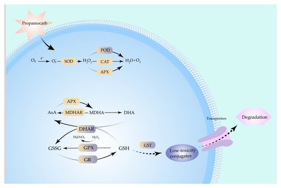 The overuse of propamocarb induces high levels of reactive oxygen species (ROS), such as superoxide (O2−) and hydrogen peroxide (H2O2) [4]. Typically, plants depend on their antioxidant system, including enzymatic and nonenzymatic compounds, to protect against ROS damage [6]. In the antioxidant enzymatic system, superoxide dismutase (SOD), peroxidase (POD), catalase (CAT), ascorbate peroxidase (APX), and glutathione peroxidase (GPX) are essential for ROS scavenging [7]. In the nonenzymatic system, the ascorbate–glutathione (AsA-GSH) cycle plays a crucial role in ROS scavenging and detoxification [8]. Glutathione (GSH) forms a redox cycle with AsA to consume H2O2 and act as a recycled intermediate for H2O2 reduction [9]. APX consumes H2O2 and oxidizes AsA to monodehydroascorbate (MDHA), which gets reduced to AsA. Then, dehydroascorbate reductase (DHAR) oxidizes GSH to glutathione disulfide (GSSG), and DHA is reduced to AsA. Meanwhile, glutathione reductase (GR) restores GSSG as GSH with NAD(P)H [10]. Therefore, enhancing the antioxidant systems for ROS scavenging is crucial in protecting against propamocarb stress and phytotoxicity.