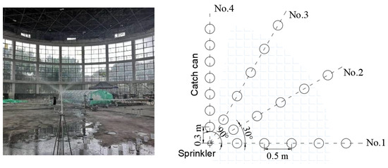 The experiments were carried out in the Sprinkler Irrigation Laboratory of Jiangsu University (Zhenjiang, China). The system of irrigation performance is shown in Figure 2. The test equipment primarily includes a pipeline system, Centrifugal pump(Grundfos: Shanghai; China), pressure gauge (HongQi: Shanghai; China), electromagnetic flowmeter (ShunLaiDa: Shanghai; China), sprinkler, tape measure, and rainfall collector. The catch can diameter is 11 cm; the height is 20 cm; the arrangement was a ray; the included angle was 30°; and the spacing between the catch can was 0.5 m [14].
