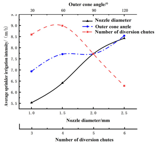 As shown in Figure 4, the diameter of water outlet significantly affected the average application rate. An increase in the diameter of the water outlet resulted in an approximately linear increase in the intensity of average sprinkler application. The average sprinkler application rate increased with the increase in the angle of the refraction surface. When the cone hole distance was increased, the average sprinkler application rate first increased and then decreased. A cone hole distance of 1.5 mm produced the most intense average sprinkler application.