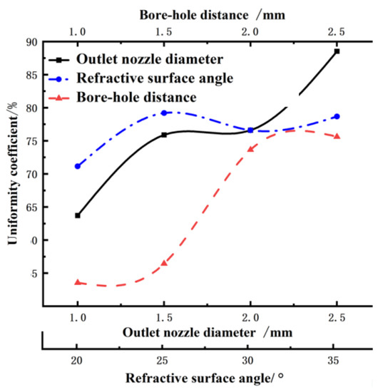 As shown in Figure 5, the sprinkler uniformity coefficient increased as the outlet diameter increased. The maximum uniformity coefficient was 88.53% when the outlet diameter was 2.5 mm. The uniformity coefficient of sprinkler fluctuated with the increase in refractive surface angle, and the maximum uniformity coefficient was 78.20% when the refractive surface angle was 25°. The uniformity coefficient of the sprinkler increased with the increase in cone hole distance, and the range of variation was 54.42~78.82%. The range of values of the cone hole distance was 1.0~2.5 mm, and the uniformity coefficient was greater than 75%.