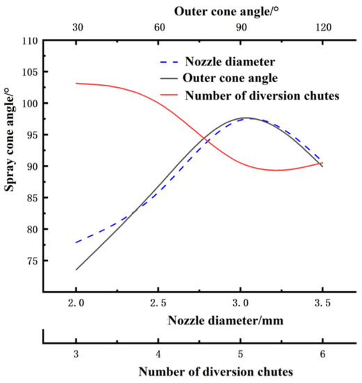 The spray cone angle is an important parameter that is used to evaluate the quality of sprinklers that spray pesticides [17]. Under the same flow rate, a larger spray cone angle helps improve the performance of spraying pesticides and droplet coverage area of the sprinkler and reduce the system cost. Figure 6 shows the effect of different nozzle diameters, the number of diversion chutes, and the outer cone angle on the spray cone angle.