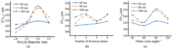 Droplet size is the main indicator of the quality of sprinkler atomization. Smaller droplets help to improve the pesticide coverage, but they are likely to cause droplet drift, which results in pesticide waste and environmental pollution. Larger droplets have difficulty being absorbed by leaves and pests, but they help to improve the penetration of droplets [18,19,20]. Figure 7 shows the effect of key structures, such as different nozzle diameters, numbers of diversion chutes and outer cone angle, on the droplet particle size at different distances of the sprinkler from the measuring surface. The droplet size is expressed as the droplet volume median diameter (Dv0.5).