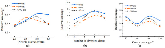 The influence of key structures on the relative range of droplet sizes. (a) Nozzle diameter; (b) number of diversion chutes; (c) outer cone angle.