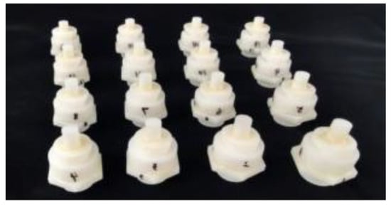 On the basis of the test results in Section 3.1, the L16 (43) orthogonal test table was designed. The test scheme is shown in Table 4, which includes the parameters of nozzle structure 4. The irrigation test sprinkler is shown in Figure 9, and the spray sprinkler is shown in Figure 10. The test working pressure was 100 kPa, and the test method was the same as that in Section 2.2.