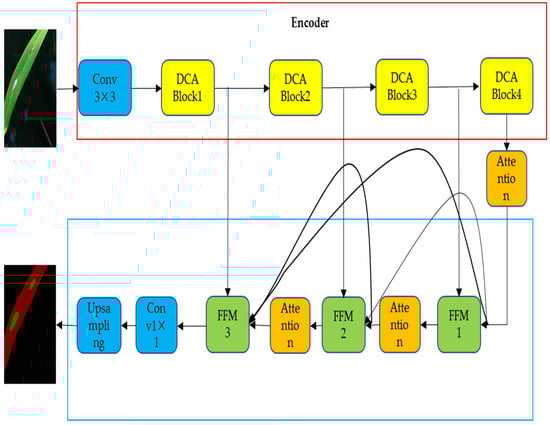 The overall network structure of the multi-scale feature fusion and attention mechanism (DFFANet)-based rice paddy disease segmentation method is shown in Figure 1. The network is implemented based on an encoder and decoder structure, which mainly consists of a feature extraction (abbreviated to DCABlock) module, a feature fusion (FFM) module, and an attention mechanism (Attention) module. The encoder module is used to extract the shallow and deep features of rice blast disease, which mainly consists of a 3 × 3 convolution operation with four DCABlock modules. The decoder module mainly consists of three feature fusion modules, FFM, and Attention, which further fuse the multi-level features and connect the output of each stage of the preorder to other stages of the postorder through dense connections to achieve reuse of features, which can integrate features at different scales and preserve richer rice blast information. The attention module refines the features in the decoding process to avoid the loss of valid information during decoding. Finally, the fused feature maps are subjected to convolution operation, and then the spatial information of the images is recovered by quadruple upsampling.