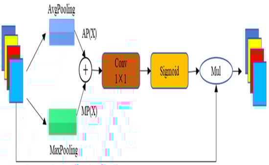 Attentional mechanisms can use deep information to guide feature learning and have also been shown to facilitate semantic segmentation [26]. In this study, the DFFANet network structure is designed with an attention module with only 0.15 M parameters to focus on the valuable parts of the current segmentation task for rice pest feature fusion, as shown in Figure 4. Let the input feature map X ∈ RC × H × W (where C represents the number of channels, H represents the feature map height, and W represents the feature map width); then, first generate the weight vectors AP(X) and MP(X) by global average pooling and global maximum pooling, respectively, and then fuse them together and pass the 1 × 1 convolution operation, followed by mapping them to the 0–1 interval using the Sigmoid function, and finally multiply the weight vectors with the input features by multiplying them.