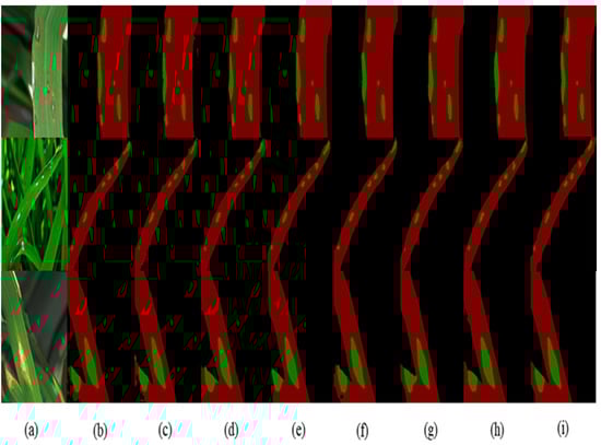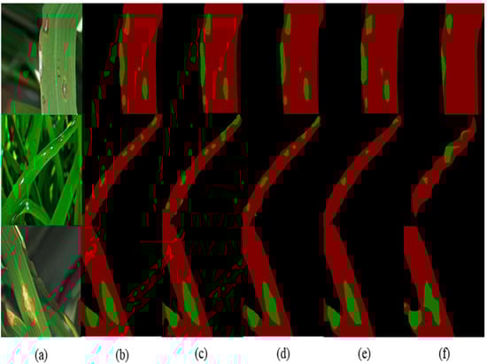 Figure 6 shows the effect of rice blast disease segmentation and recognition, which more visually represents the performance of the modules and models designed in this study. As shown in the Figure 6f is the network with only a DCABlock module, whose segmentation effect is the worst, not segmenting out all the disease spots. With the increase in feature fusion modules, with Figure 6e showing the addition of the FFM1 module, Figure 6d showing the addition of the FFM1 and FFM2 modules, and Figure 6c showing the addition of the FFM1, FFM2, and FFM3 modules, the segmentation effect becomes better and better, indicating that by adding the feature fusion modules and using a dense connection to integrate the contextual and spatial information of the rice blast disease images, we can better perform the segmentation. Thus, the content of rice blast images can be better recognized and perceived by adding the feature fusion module. Figure 6b shows the segmentation effect after further addition of the attention mechanism module, where the third row in Figure 6, due to the similarity of the shaded leaf in the lower left corner of the original image Figure 6a with the background environment, causes this area to be more difficult to be segmented.