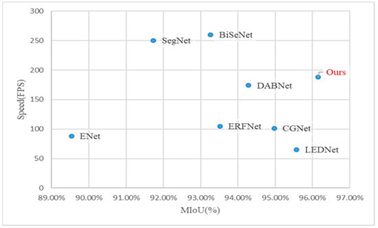 The segmentation accuracy, model running speed, and number of parameters were used to compare the performance between the models. The segmentation accuracy of the method designed in this study is 96.15%, the speed is 188 FPS, and the parameter size is 1.4 M. Compared with the ENet model, the accuracy is increased by 6.61%, the speed is increased by 100 FPS, and the number of model parameters is increased by 1.04 M. Compared with the SegNet model, the accuracy is increased by 4.42%, the speed is increased by 62 FPS, and the number of model parameters is increased by 0.46 M. Compared with the BiSeNet model, the accuracy is increased by 2.89%, the speed is increased by 72 FPS, and the amount of model parameters is reduced by 4.4 M. Compared with ERFNet, the accuracy is increased by 2.63%, the speed is increased by 83 FPS, and the amount of model parameters is reduced by 0.66 M. Compared with the CGNet model, the accuracy is increased by 1.18%, the running speed is increased by 87 FPS, and the number of model parameters is increased by 0.91 M. Compared with the LEDNet model, the accuracy is increased by 0.58%, the running speed is increased by 123 FPS, and the amount of model parameters is increased by 0.49 M. Compared with the DABNet model, the accuracy is increased by 1.87%, the running speed is increased by 13 FPS, and the number of model parameters is increased by 0.65 M.