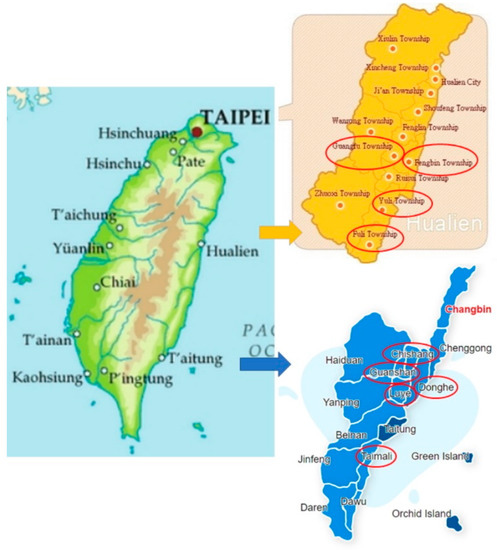 Hualien takes the townships of Jian, Shoufeng, Guangfu, Fengbin, Yuli, and Fuli are the main organic agricultural leisure areas. Meanwhile, the main organic agricultural towns in Taitung are Chishang, Guanshan, Luye, Donghe, and Taimali townships (Figure 1). The reason for choosing these areas in this research is because these areas abide by the principle of recycling and sustainable utilization of Taiwan’s organic agricultural and natural resources. These areas are not allowed to use synthetic chemicals to achieve the goal of producing natural and safe agricultural products [6].