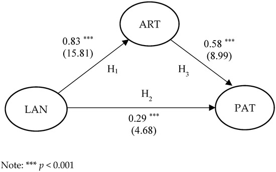 Based on the analysis, the verification of the research hypothesis is presented in Table 5. All the hypotheses are accepted (p < 0.050). LAN has a significant positive effect on ART and PAT, and ART has a significant positive effect on PAT. The coefficient of the mediating effect of LAN on PAT through ART is 0.48, which is much higher than the direct effect of LAN on PAT of 0.29. That is, ART is an essential mediating variable.