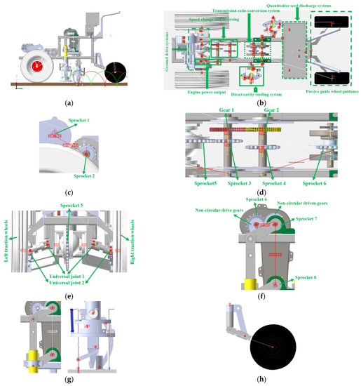 Constraint relationships of the cavity planter with vertical insertion. (a) Virtual prototype model. (b) Drive train division. (c) Engine power output. (d) Speed changing and reversing. (e) Ground drive system. (f) Transmission ratio conversion system. (g) Cavity seeding system. (h) Passive wheel guidance.