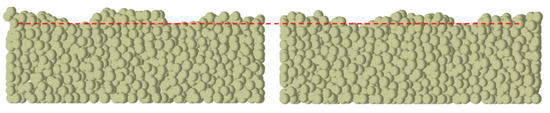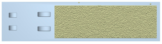Based on the soil type of China’s northwest dry zone, a simplified soil simulation model was developed to improve simulation efficiency. Specifically, soil model (length 3100 mm × width 1000 mm × height 320 mm) was created using SolidWorks 2018.sp5, saved as. x_t format and then imported into EDEM 2018 (Altair co., Richardson, TX, USA) through the geometry option [15,16,17]. Hysteretic Spring and Linear Cohesion were selected to simulate sandy loam, and the related simulation parameters are shown in Table 1. The Hertz–Mindlin model and Linear cohesion model were chosen to simulate sandy soils and the simulation parameters are seen in Table 2. The soil particles’ radius was set to 10 mm, and the variance of the radius was 0.05. The soil simulation parameters are shown in Table 3 at the same level. Therefore, the simplified model is indicated in Figure 3.