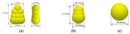 Intercropping effects with maize also occur with the cavity seeder. The effect of maize shape on the seeding performance was investigated. Three typical shapes of maize models were used. Among them, the horse tooth seed consisted of nine unequal spherical particles, the spherical cone consisted of three unequal radius spherical particles, and the spherical particle consisted of one spherical particle, as presented in Figure 4.
